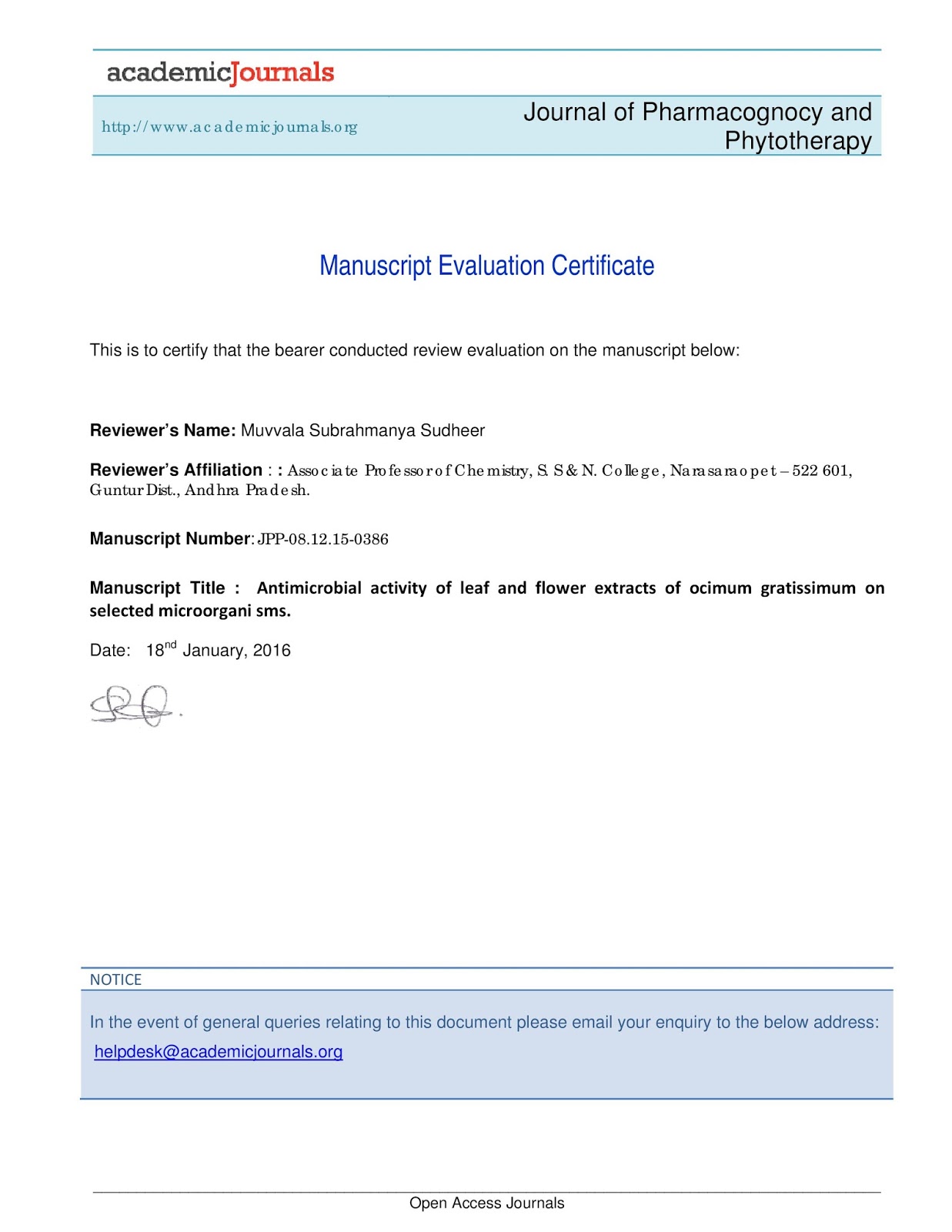 Manuscript Evaluation Certificate – Journal of Pharmacognosy and Phytotherapy